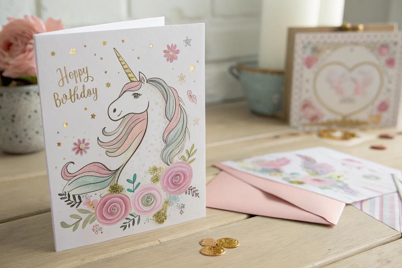 Give your card a fun twist with a pop-up unicorn that leaps out when opened. I love how this adds an interactive element that kids and adults alike will adore.