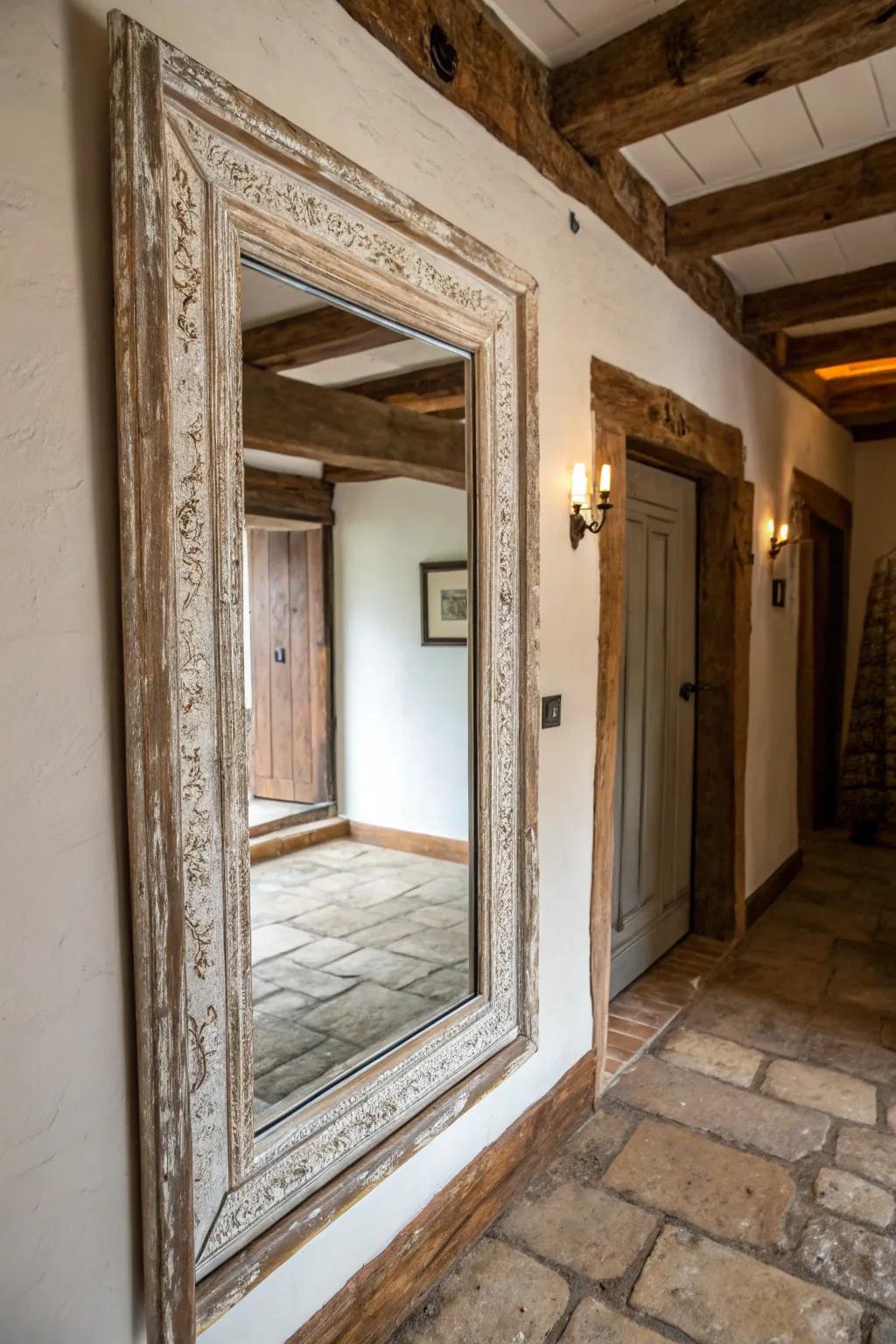 Mimic the look of window panes on your mirror for a touch of elegance. I did this with a large mirror in my living room using thin strips of wood, and it added a classic charm. This approach works especially well for DIY full-length mirror frames. It’s a simple yet impactful DIY.