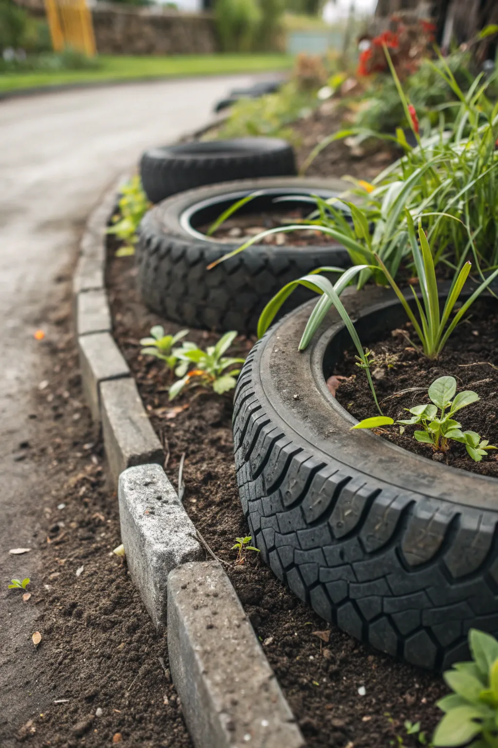 Use cut tires to create garden borders that are not only practical in keeping soil in place but also add a striking visual element to your garden.