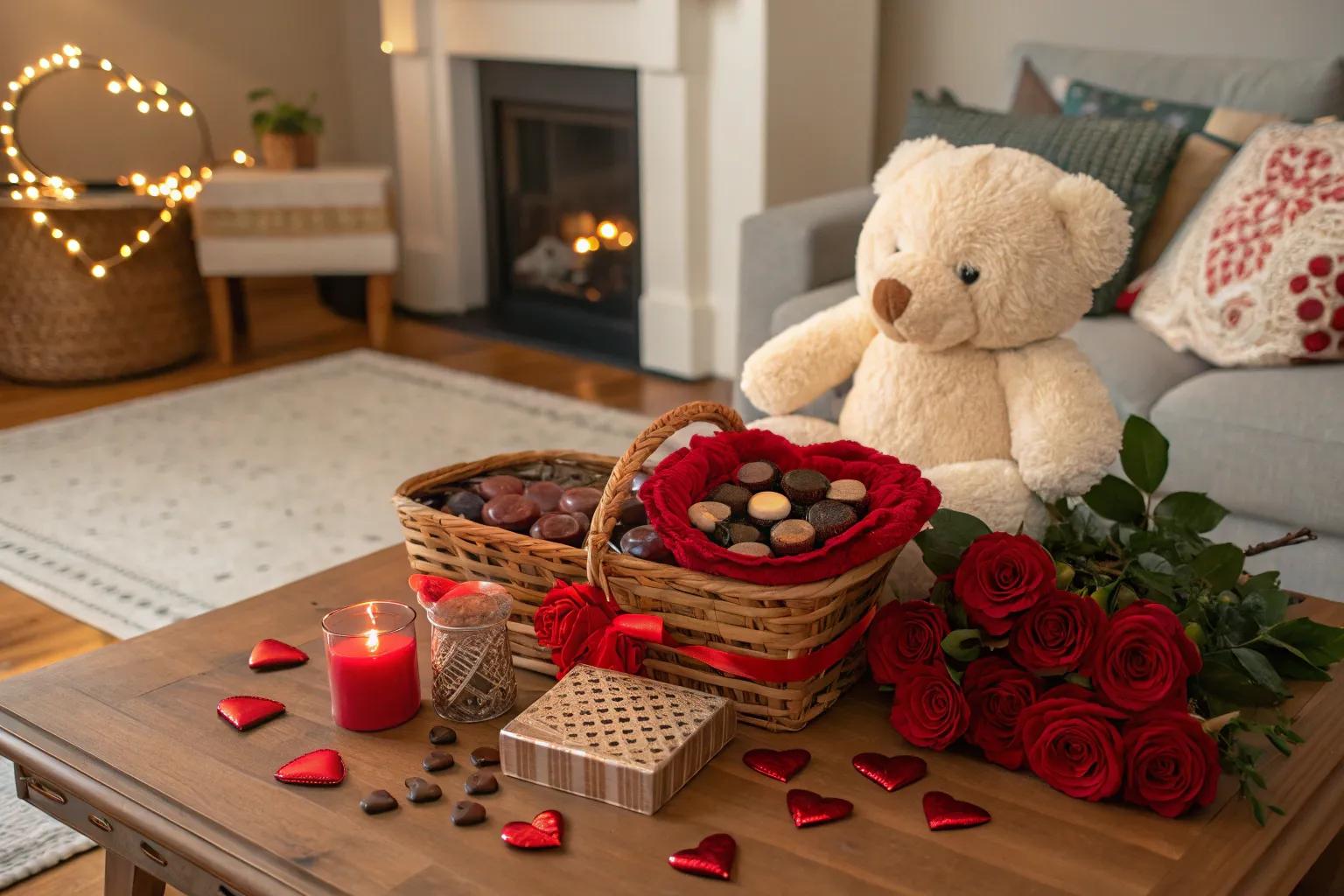 Start with the timeless combination of chocolates and sweets, a classic among Valentine’s gift basket ideas. I remember gifting this to my sister, and her face lit up like a kid in a candy store. Fill your basket with assorted chocolates, caramels, and a few heart-shaped candies for that extra touch of sweetness.