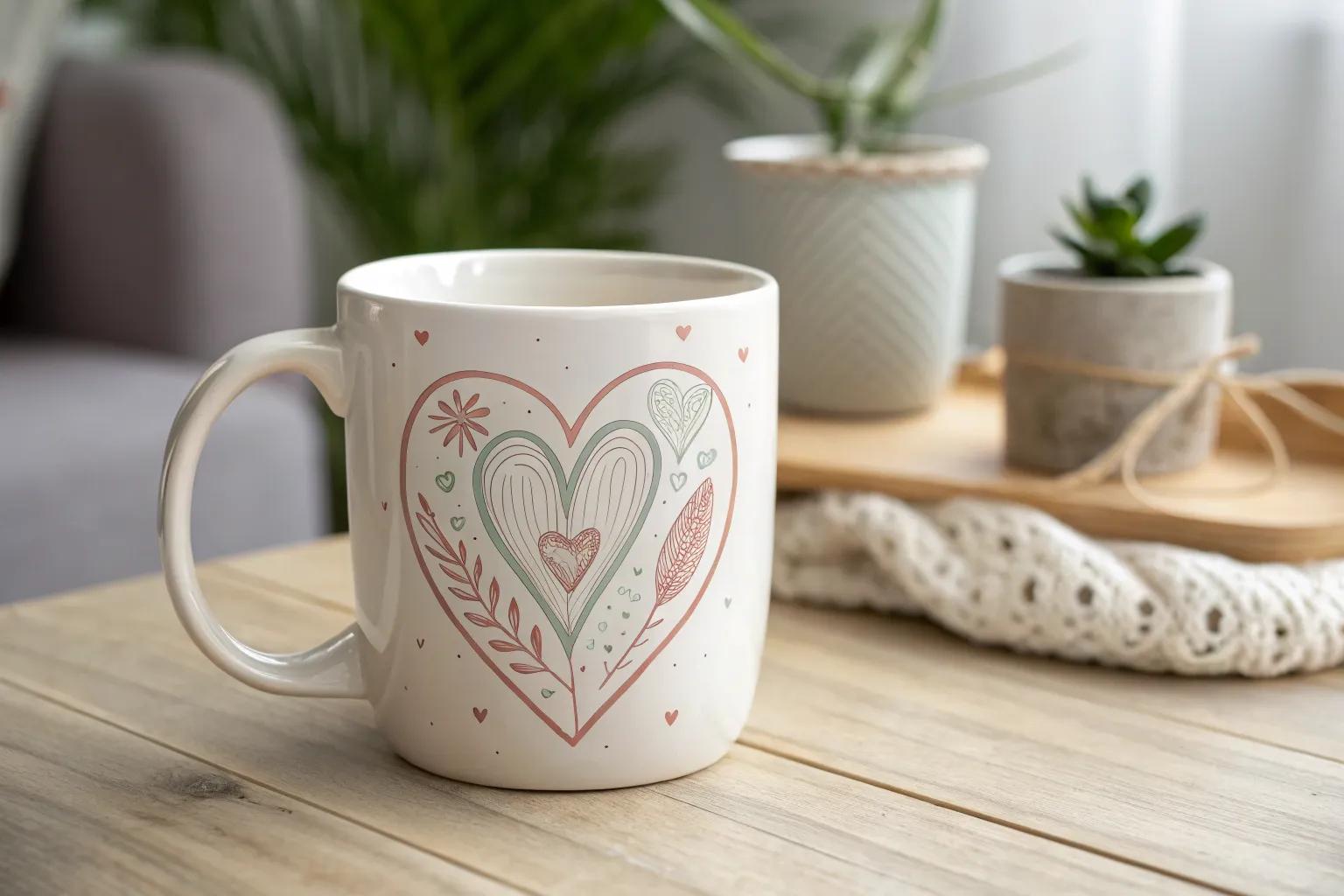 Sometimes less is more. A minimalist design with a clean heart or ‘Love’ in a stunning font can make a big impact. For more inspiration, check out these minimalist mug art ideas.