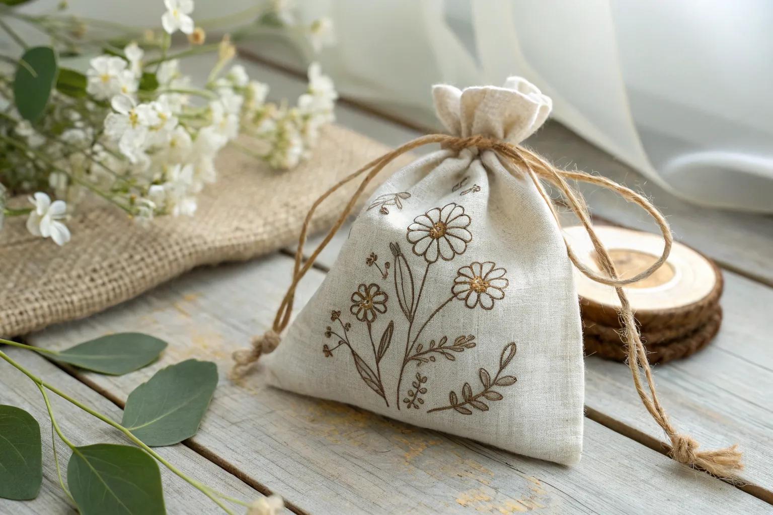 - Canvas Drawstring Gift Bags: Delight guests with eco-friendly canvas bags featuring charming floral designs. Perfect for sustainable gifting.