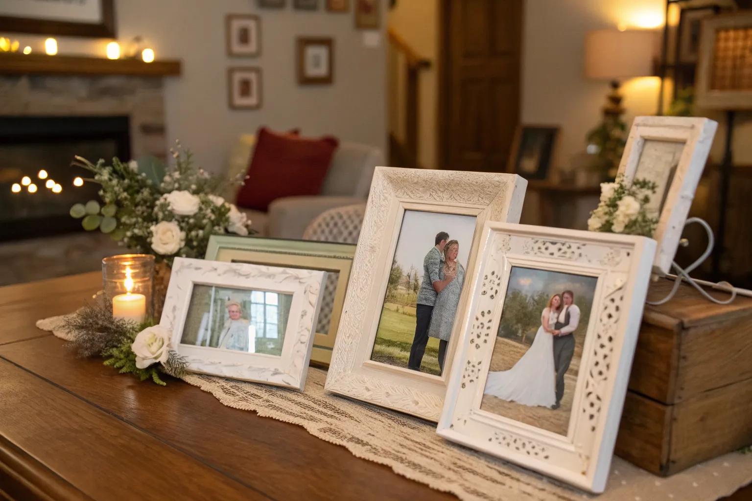 Add a personal touch to your wedding photo display with customized frames featuring your names or wedding date. I’ve seen this simple addition turn ordinary frames into lifelong keepsakes.
