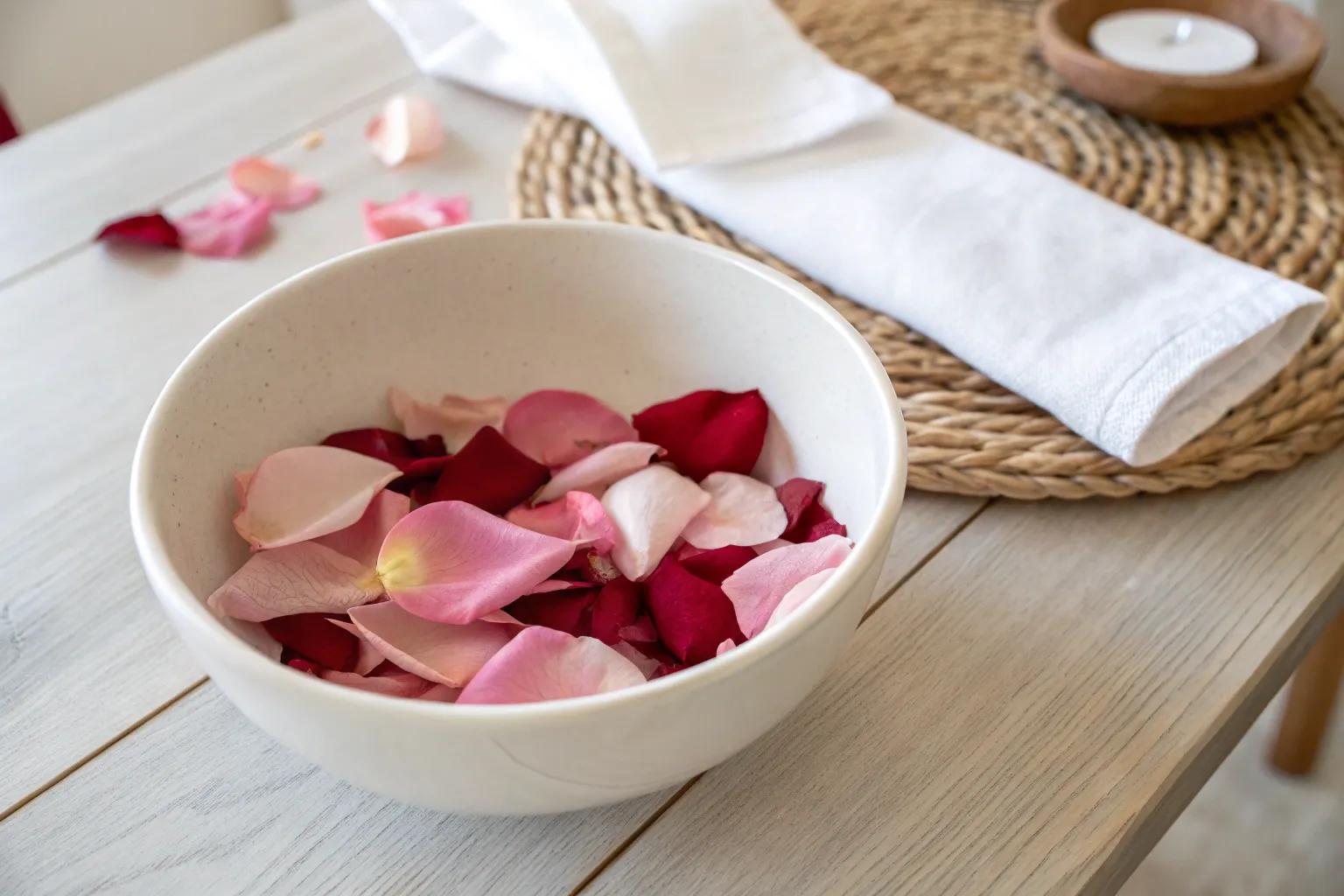 Scatter rose petals on the dining table to enhance a candlelit dinner with elegance. This trick, along with other flower craft ideas, always makes my meals feel special, even on a Tuesday night.
