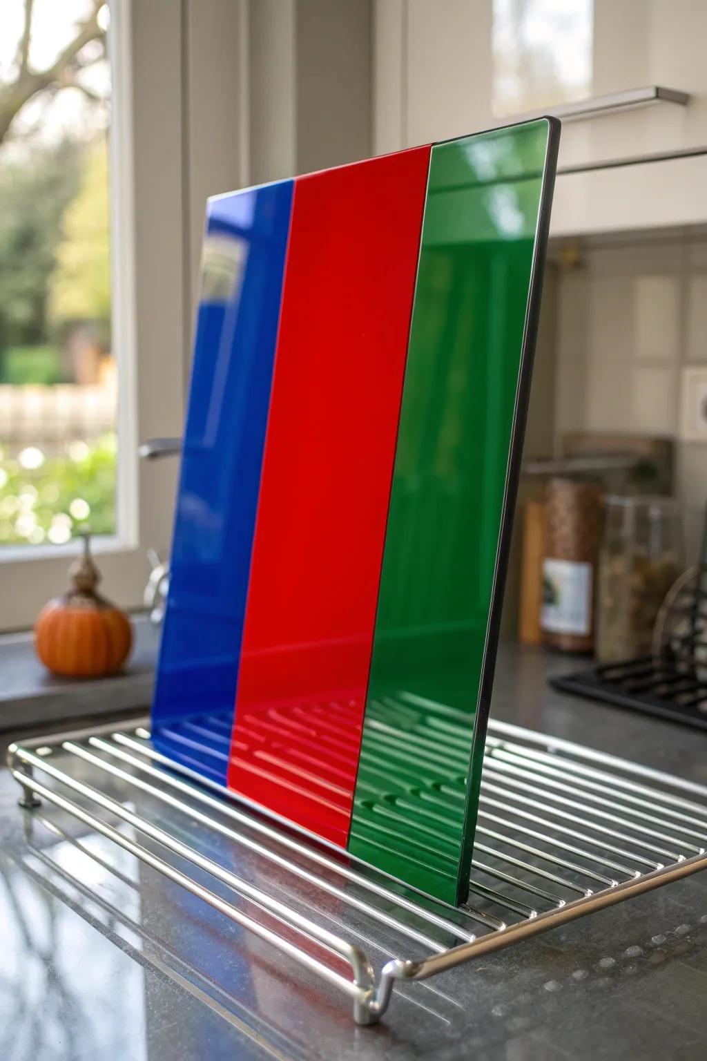 For a modern twist, I painted plexiglass panels in bold colors and attached them to my kitchen racks. It’s a pop of color that guests always compliment.