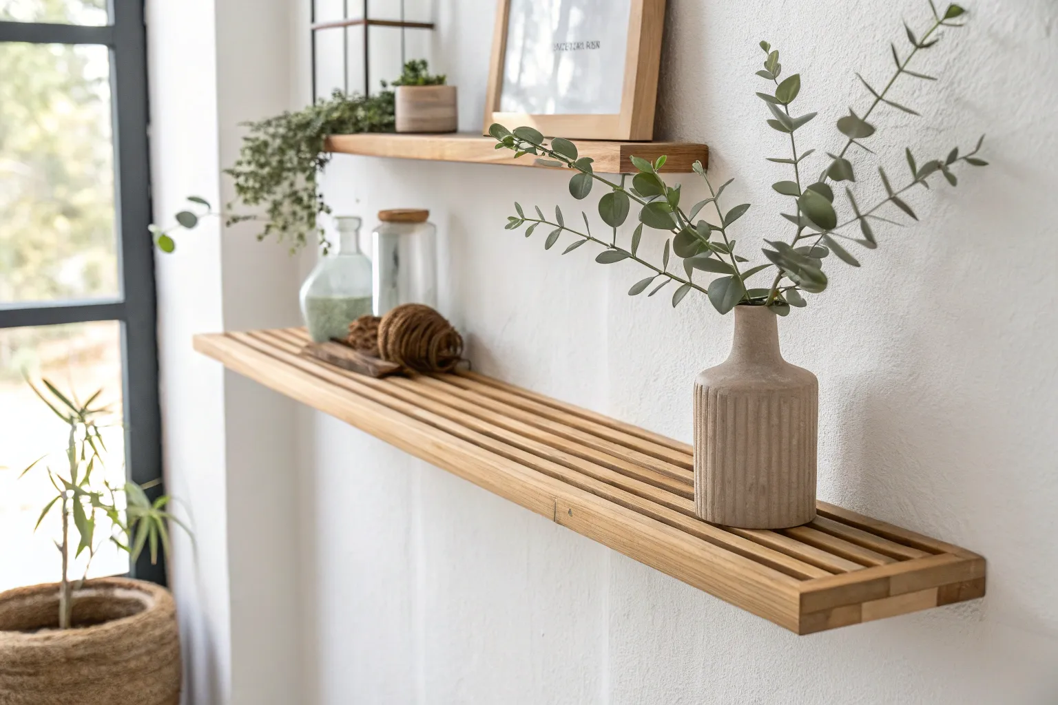 Craft floating shelves using wood slats to add both style and storage. They’re easy to make and look fantastic holding your favorite books or plants.